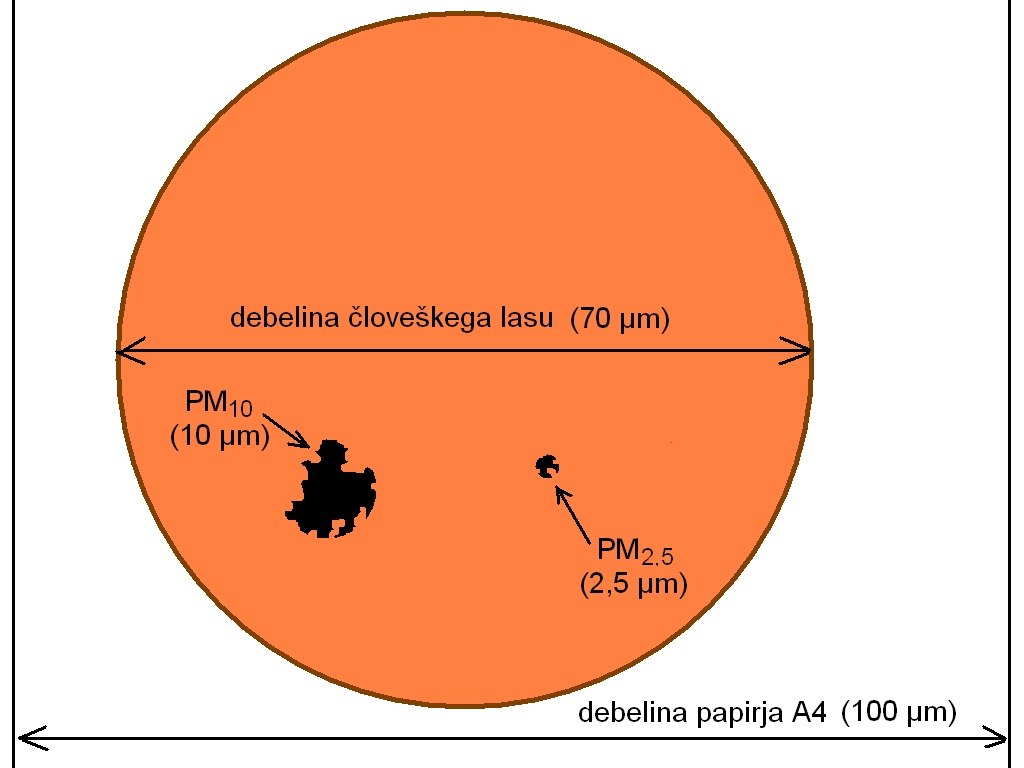 Na spodnji sliki je ponazorjena primerjava med debelino pisarniškega papirja A4, premerom človeškega lasu ter velikostmi delcev PM10 in PM2,5